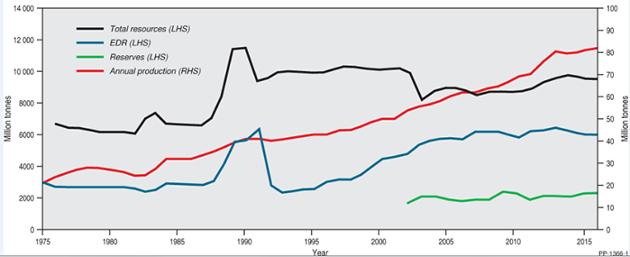 | Year | Demonstrated Resources | Inferred Resources2 | Accessible EDR3 | Australian Mine Production4 | World Economic Resources5 | World Mine Production5 | ||