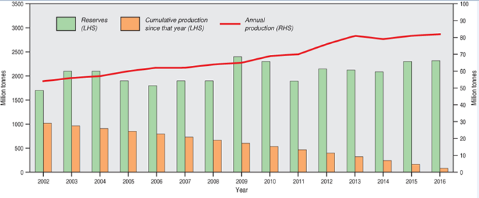 Figure 1. Bauxite Ore Reserves and annual production 2002-2016, as well as cumulative production since each year. LHS/RHS = refer to axis on left-hand side/right-hand side.