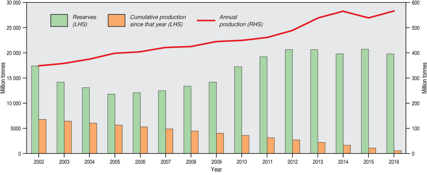 Figure 1. Black coal Ore Reserves and annual production 2002-2016, as well as cumulative production since each year. LHS/RHS = refer to axis on left-hand side/right-hand side.