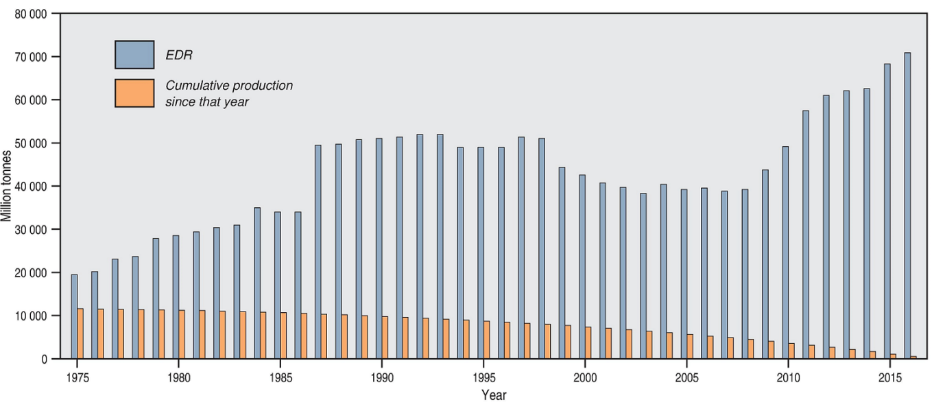 Figure 2. Economic Demonstrated Resources of black coal 1975-2016, as well as cumulative production since each year.