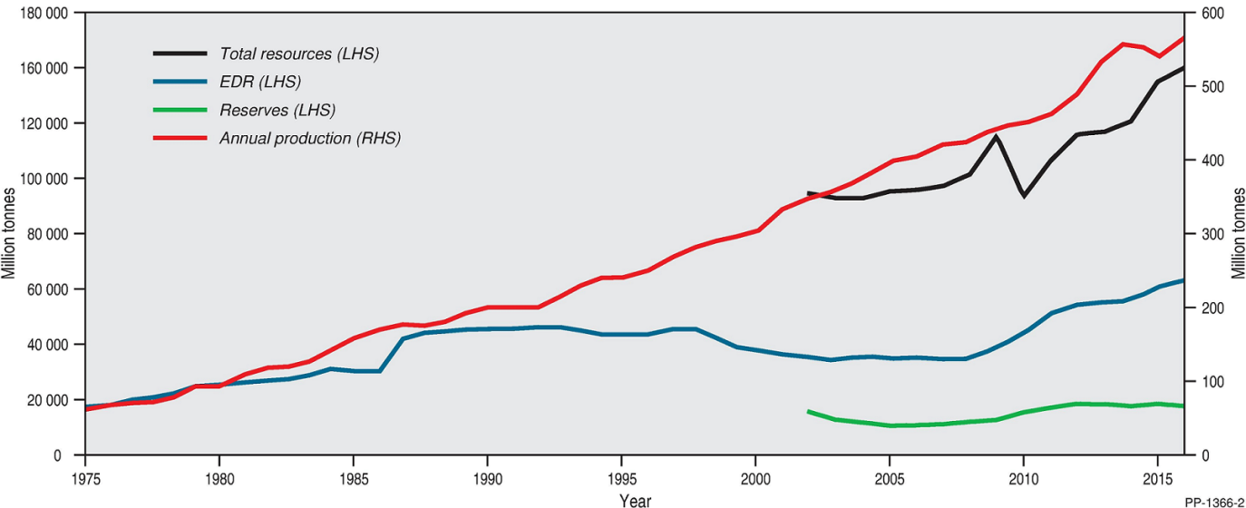 Figure 3. Trends in total resources, Economic Demonstrated Resources, Ore Reserves and annual production of black coal, 1975-2016. LHS/RHS = refer to axis on left-hand side/right-hand side.
