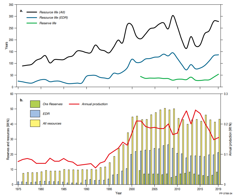 Figure 3. (a) Trends in nickel reserves and resource life. These ratios are derived from (b) nickel Ore Reserves, EDR, all resources (EDR + Subeconomic Demonstrated Resources + Inferred Resources), and annual production, 1975–2019.