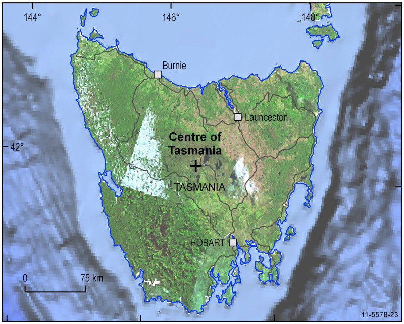 One possible centre for Tasmania is found on the western shore of Little Pine Lagoon. This small lake lies next to the Marlborough Highway, between the towns of Bronte and Miena. On the Lyell Highway, just a short distance east of Bronte, lies a cairn which was erected in 1983 by members of the Institution of Surveyors (Australian Tasmanian Division). This marker commemorates the early surveyors who explored and mapped the state, and marks Trig Point 715 - said to be near the geographical centre.