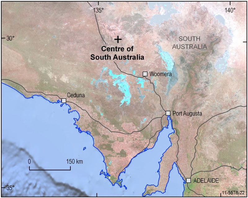 Despite three sides of its border being straight lines, defining the centre of South Australia is no easier thanks to an irregular shaped coastline. According to one method, the centre is near the Churchill Smith bore, which is approximately 12km north-east of the Mt Eba cattle station. In relation to more commonly known landmarks, the centre of South Australia is located some distance south-west of Lake Eyre.