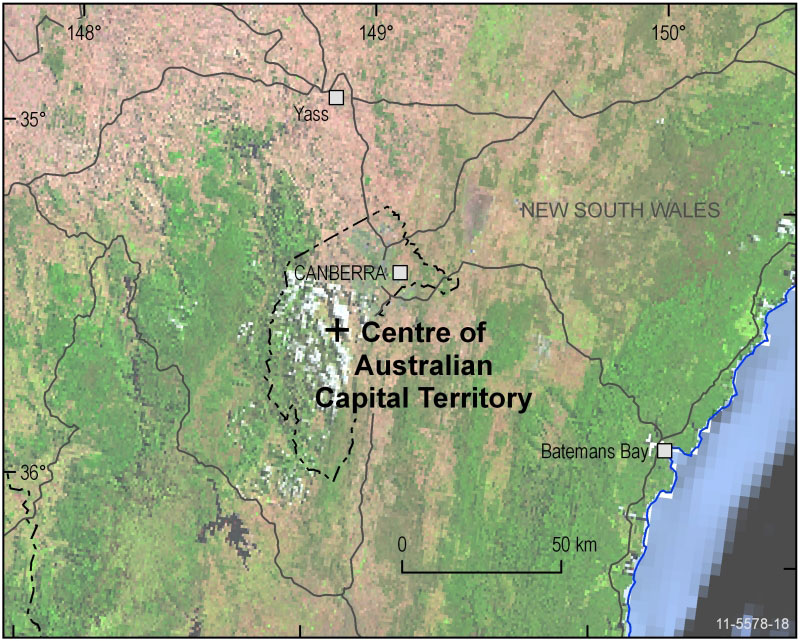 The centre of the Australian Capital Territory might be thought of as the former site of the Honeysuckle Creek Tracking Station, approximately 35km south-south-west of Canberra. The tracking station played a leading role in the NASA Apollo missions, closing in 1981 with the end of the Skylab program. The radio telescope was dismantled and relocated to Tidbinbilla in 1983.