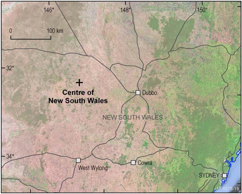 One possible definition of the centre for New South Wales is located just off Cockies Road, 33km west-north-west of Tottenham (Tottenham is 110km west of Dubbo). This spot, south of the Fiveways Intersection, is marked by a large sign, constructed for Australia's Bicentennial celebrations.