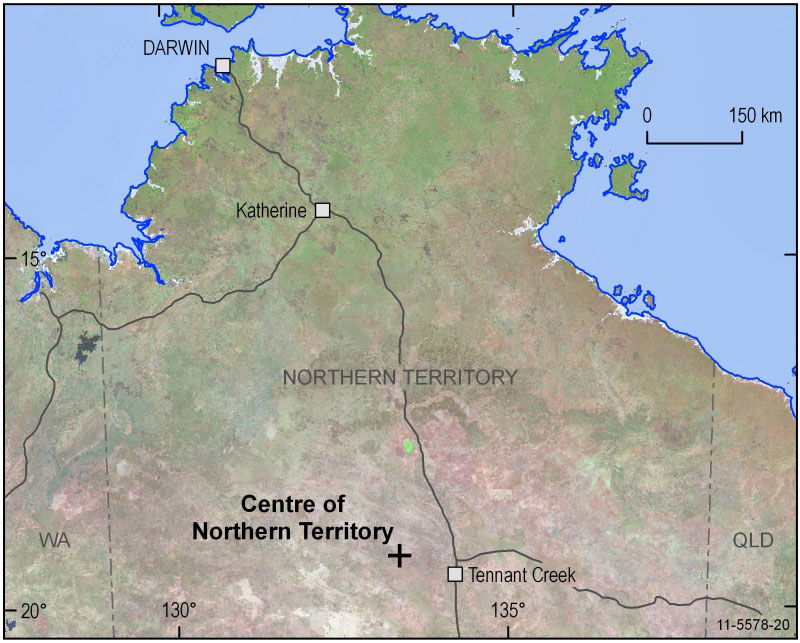 Using the method described earlier, one estimate of where the centre of the Northern Territory lies can be found approximately 91 km west-north-west of Tennant Creek. A short distance past the Kartijirarrakanya Claypan, this centre is in a particularly harsh, arid part of the territory.