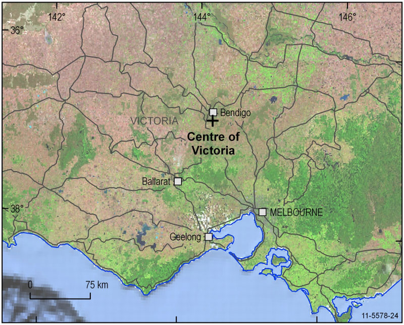 Located around 10km south-south-east of Bendigo, the centre of Victoria might be considered to be on the steps of the Mandurang Uniting Church. No longer in use, the church sits on the site that corresponds with centroid calculations from a number of different organisations, including Geoscience Australia, the Department of Natural Resources and Environment (DNRE), and the Department of Geospatial Science, Royal Melbourne Institute of Technology (RMIT).