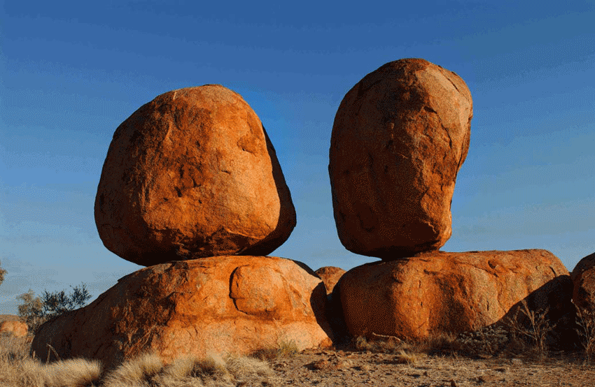 Karlwe Karlwe, or the Devil's Marbles, near Wauchope in the Northern Territory are a collection of large rounded granite boulders, many of which are precariously balanced on top of another. The granite here formed from molten rock which solidified beneath a layer of sandstone and developed vertical and horizontal fractures. Over time, the sandstone eroded away exposing the granite, which then weathered into soft sand and clay surrounding hard bits of granite called corestones. Gradual removal of the soft sand and clay has exposed the rounded boulders, allowing them to be perched on top of one other. According to Aboriginal dreaming, the rocks are sacred and are the fossilised eggs of the Rainbow Serpent.