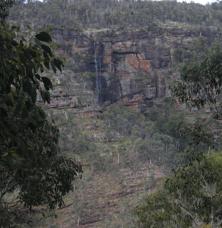 Because Dandongadale Falls is fed by a relatively small catchment on the Cobbler Plateau, the flows over the falls vary greatly and are very seasonal, with strong flows during winter and the spring thaw in the alpine catchment area. However, the flows can be very low or almost non-existent during the summer and in drought periods as is illustrated in the accompanying photo taken during the recent prolonged drought. The darker staining caused by water on the rocks surrounding the falls shows that at its height, the volume of water can be extensive.