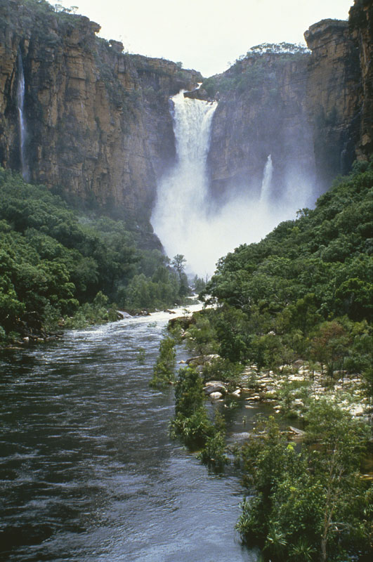 Plunging over an escarpment in the World Heritage listed Kakadu National Park, Jim Jim Falls drops 200 metres into a large pool surrounded by 150 meter high cliffs. The falls are at their most spectacular during the wet season between November and April, but can be viewed only from a light plane or helicopter because roads in the area are mostly inaccessible at that time of year.