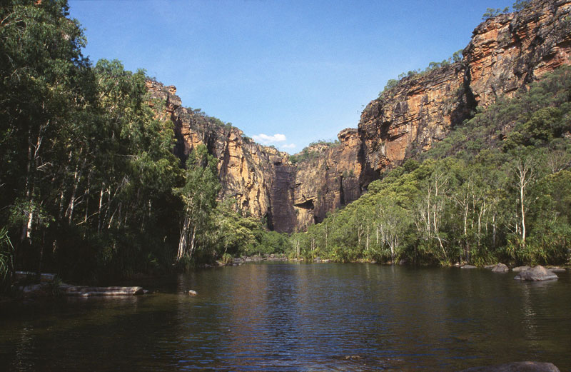 At other times the falls cease flowing altogether as illustrated by the image on the right, but the waterhole at the foot of the falls is sufficiently deep for it to remain a viable source for water throughout the year.