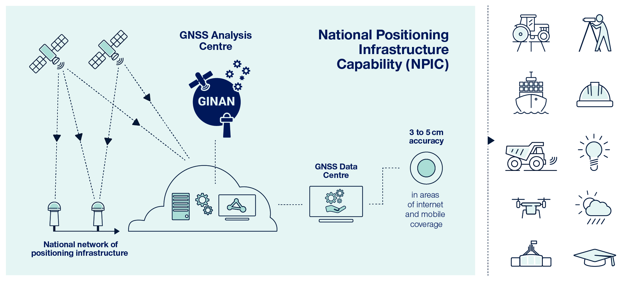 This diagram illustrates how Ginan integrates with NPIC’s network of positioning infrastructure and provides correction data to users through an internet connection
