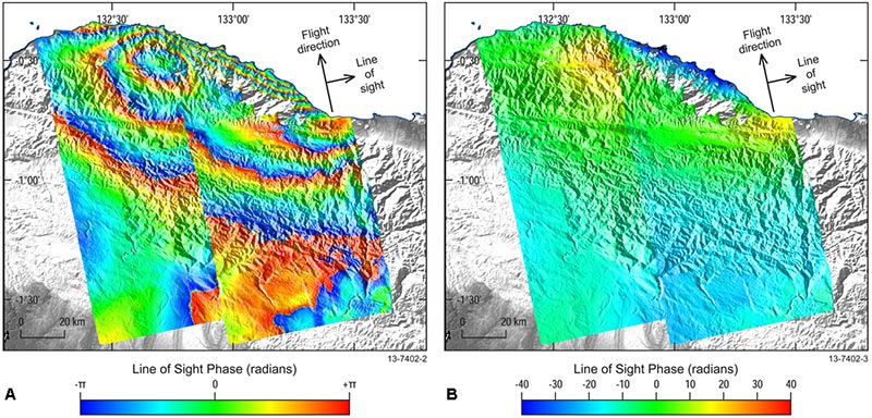 Figure 2: A wrapped (A) and unwrapped (B) interferogram of an earthquake doublet that occurred in West Papua, Indonesia created using data from the Japanese ALOS satellite. The magnitude 7.6 and 7.4 earthquakes occurred on 03 January 2009 within 3 hours of each other and were caused by subduction on the offshore Manokwari Trench, which is located north of the coastline. Unwrapped phase in radians can be converted to 'range change' or displacement in millimetres with knowledge of the satellite radar wavelength.