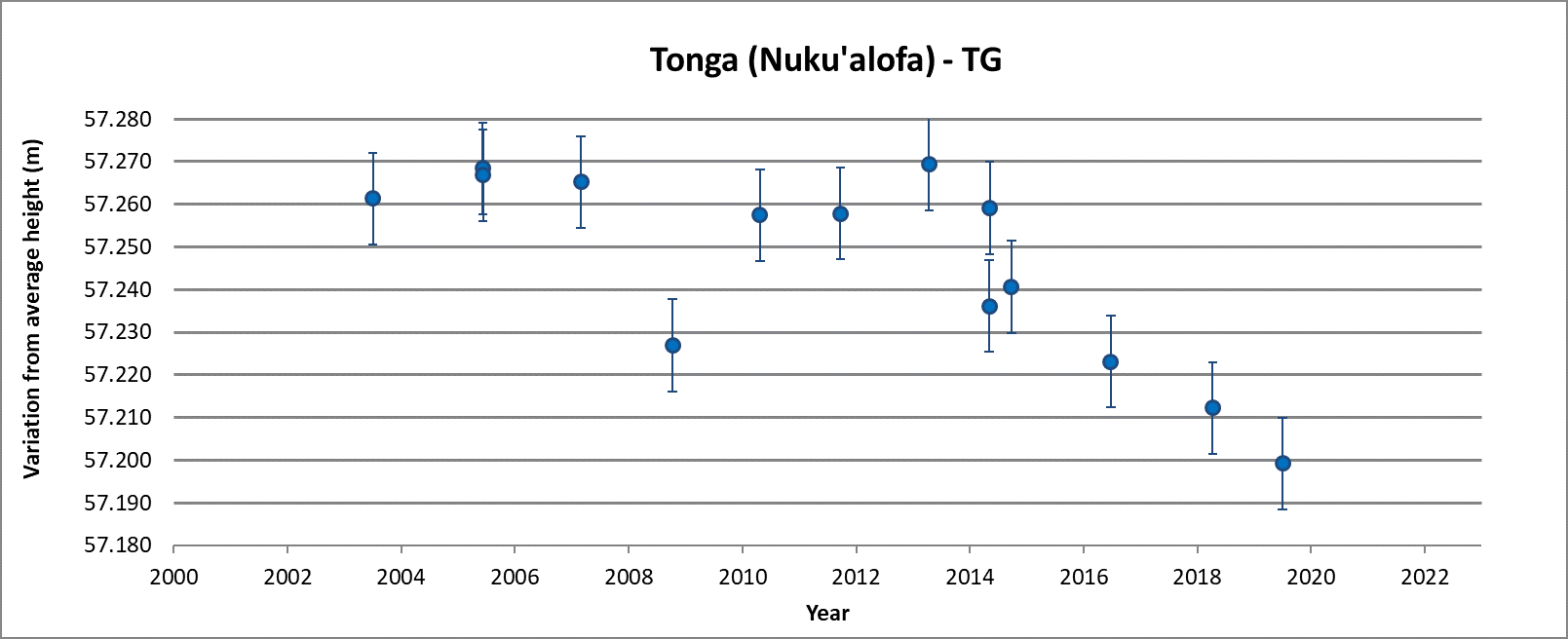 The bottom figure (TG) in each country tab shows the change in the absolute height of the tide gauge. The error bars show the 95% Confidence Interval.