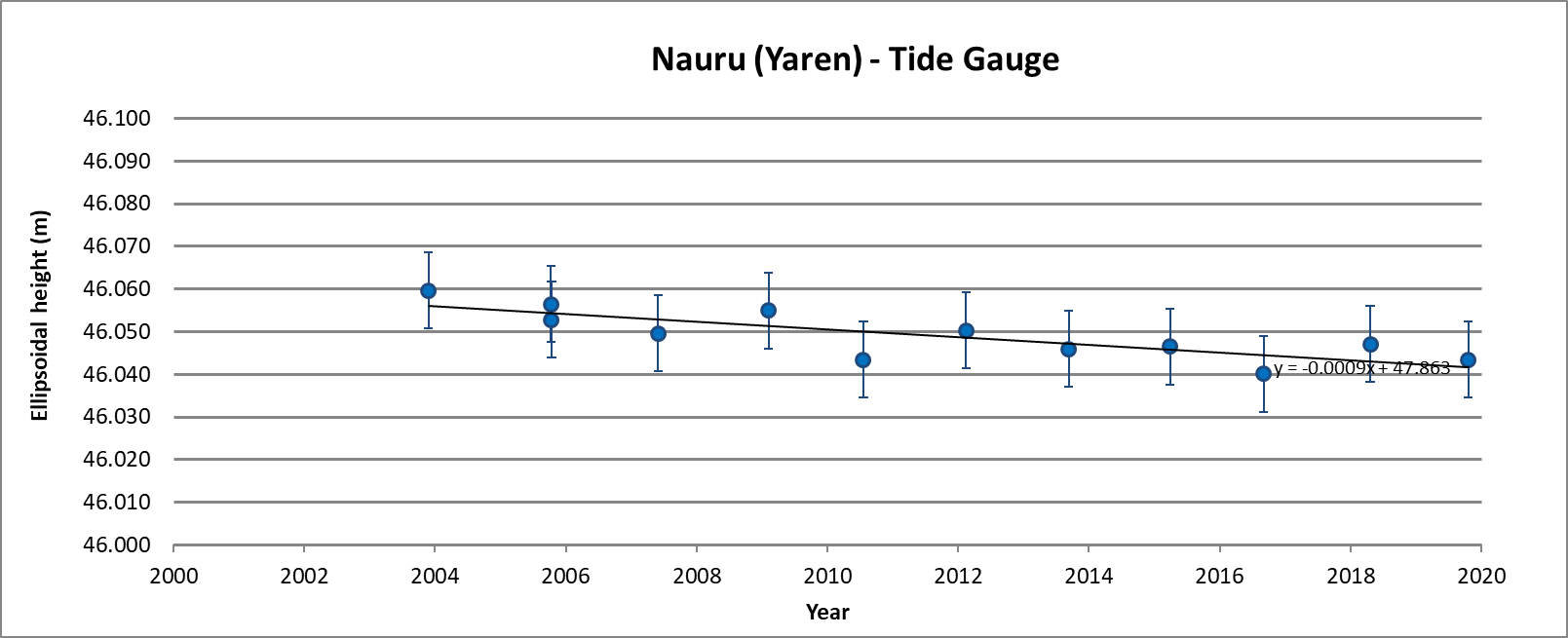 • In the 2020 Record (Brown et al., 2020), the ellipsoidal height of a benchmark at the base of the tide gauge (NAURU14) was provided instead of the ellipsoidal height of the sensor benchmark on the tide gauge (NAURU15). For this reason, the ellipsoidal heights shown here are approximately 2.1 m different to those shown in the 2020 Record. This does not impact the reported vertical rate of movement of the tide gauge.