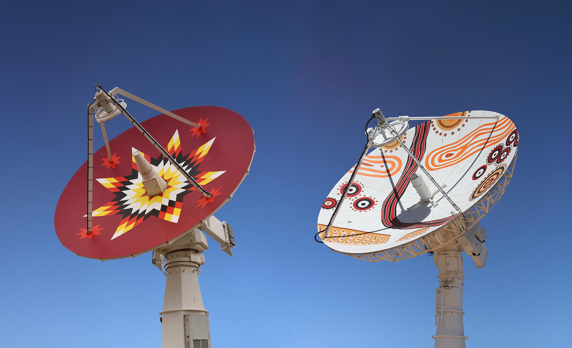 The Alice Springs Ground Station hosts two 9-metre antennas. The ViaSat antenna (left) features Lakota Sioux-inspired artwork based on an Owinja (Star Quilt) to celebrate the longstanding collaborative relationship between Geoscience Australia and the USGS. The Datron antenna (right) features artwork based on an Aboriginal painting, Caterpillar Tracks, to recognise the role of the Arrernte people as custodians of the land where the Alice Springs antennas are located.