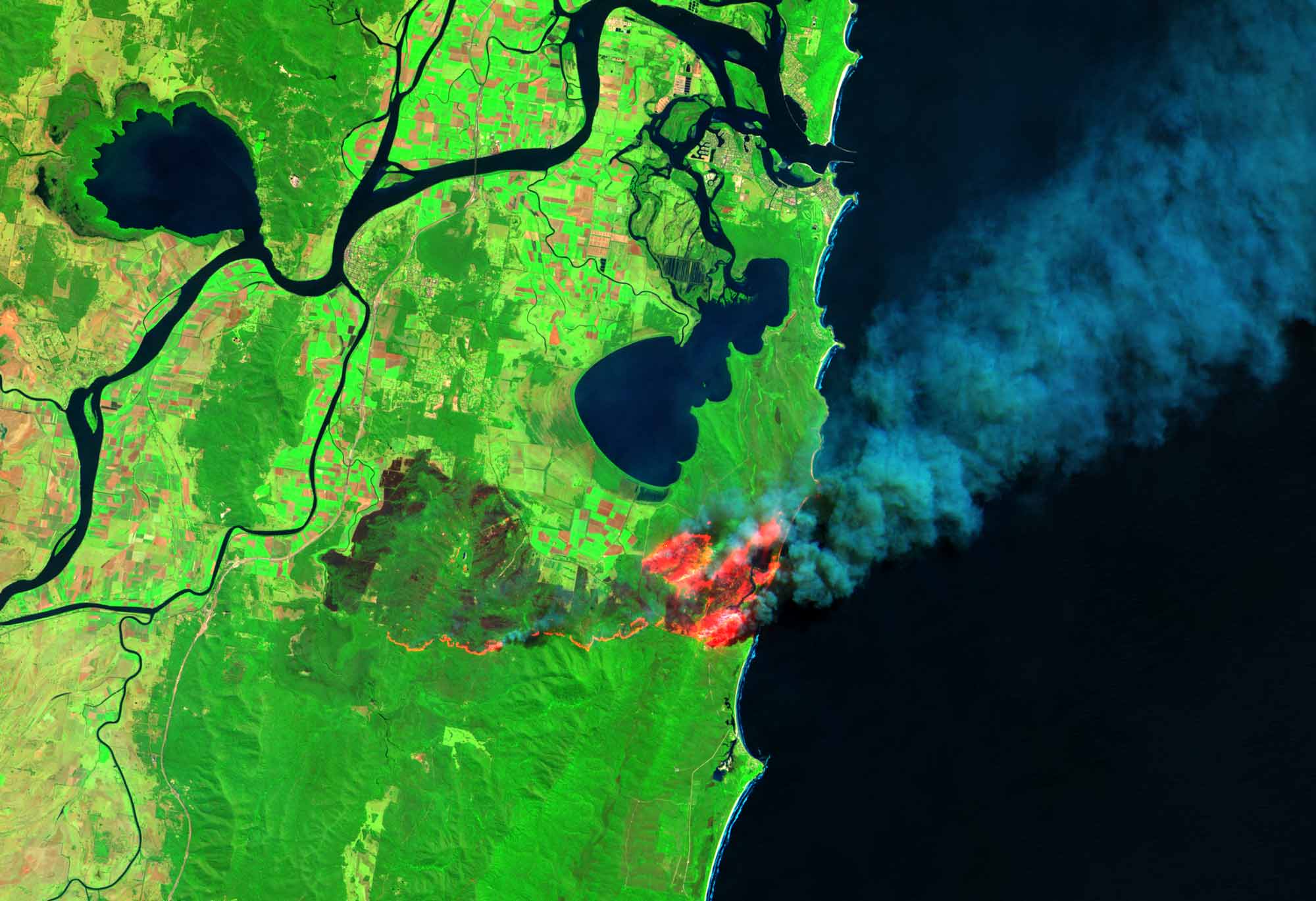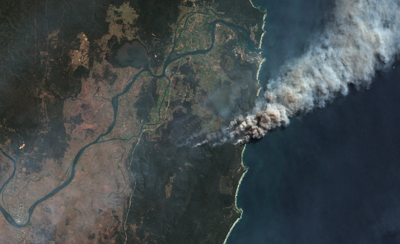 DEA Surface Reflectance - Sentinel-2 - 2019-09-09 - Yamba, NSW Sentinel-2 image side-by-side comparison of a bushfire at Yamba, NSW in September, 2019. The first image shows false colour including short-wave infrared (SWIR), revealing the extent of the fire front. The second image is its true colour. © Commonwealth of Australia (Geoscience Australia) 2021. Contains modified Copernicus Sentinel data (2019), processed by ESA, CC BY-SA 3.0 IGO doi: dx.doi.org/10.26186/146552