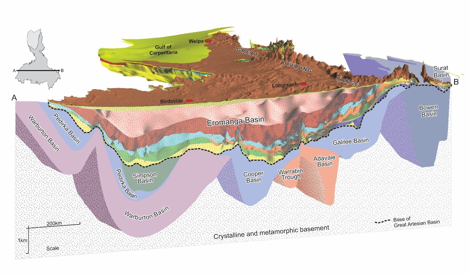 Three-dimensional slice through the GAB and underlying older sedimentary basins. Layers within the Eromanga Basin represent the major aquifers and aquitards of the GAB (Rreproduced from work undertaken for the Great Artesian Basin Water Resource Assessment (Smerdon BD, Ransley TR, Radke BM and Kellett JR (2012)))