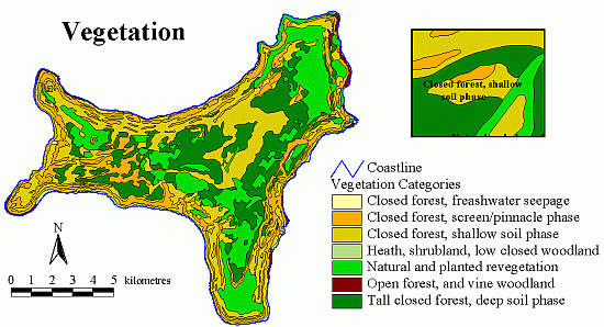 The scanned map was included in the Christmas Island GIS. It was digitised by Geoscience Australia in mid October 2001 on behalf of Parks Australia North Christmas Island. Newveg.shp is the revised version of Vegetation.shp. Dr. Pete Green a Research Fellow from EA created this .shp file by taking the original vegetation file, making all the vegetation types semi-transparent, and superimposing this theme over a composite aerial photograph of the island (Christmas.ers, generated from the 1987 aerial photos). Dr. Green then adjusted the position of the clearing boundaries (category SV) around all previously mined fields, expanded these polygons to include all major roads, and added and subtracted polygons as required. In all cases Dr. Green tried to pick the original boundary of the clearing - there has been substantial regrowth around the borders of some mined fields, but this regrowth can be distinguished from the adjacent forest by its more regular canopy. Dr. Green made a concerted effort to ONLY adjust the position of forest/clearing boundaries, and NOT forest/forest boundaries. The aerial photos are excellent for judging the position of the former, but we have no prior evidence for adjusting the latter - as far as Dr. Green knows, the positions of forest/forest boundaries have never been ground-truthed. Where boundaries were indistinct on Christmas.ers, Dr. Green occasionally made reference to two sets of black and white aerial photographs of the island taken in 1976 and 1981. In September 2003 this dataset was converted to the MGA(GDA94) projection using an x y shift (550015 = x, 8780001 = y) on the CIG85 projection. |
