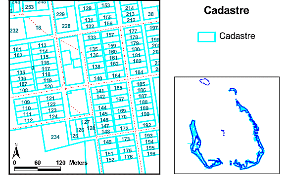 These changes were made using Arc View. December 2003: GA received an updated cadastre from GHD Pty Ltd in the CKIG92 projection. This 2003 cadastre shapefile, and all previous versions of the cadastre were projected to UTM(WGS84) zone 47S for addition to the 2003 GIS March 2003: Geoscience Australia obtained a resupply of the Cocos cadastre from DOLA via Nic dell’Aquila, Territories Office Canberra. The date of the shapefiles DOLA supplied were 7/2/03. The projection was geographics. Geoscience Australia projected the cadastre to CKIG92 using Arc View 3.2. Then using ArcGIS with all the new layer selected one node was snapped to the prior Cocos GIS cadastre. For the south eastern islands the prior polygons were used as these again did not match by around 40 meters. See the following lineage for an explanation. The prior attributes were again joined in to the DOLA cadastre. February 2000: AGSO projected the data from Geographic (WGS84) to Cocos (Keeling) Islands Grid 1992 using ArcView 3.2a projection utility. Deleted erroneous polygons (large area, small visible extent) from shapefile after checking that they were spatially non-unique and contained no attributes. AGSO also joined Cocos ground audit data acquired as a DBF to the cadastre table. August 2000: AGSO moved all small islands between Home Island and South Island to match the orthophotography. This was done by manually editing the shapefile in ArcView 3.2 (XY-shift and/or Stretch). Islands which formed logical groups were moved/stretched as a group in order to minimise modification of the original data. August 2000: AGSO warped South Island and all nearby small islands to visually match the orthophotography (translation/rotation/stretching was not adequate). This was done using the ShapeWarp 2.2 ArcView Extension and a third-order polynomial fit on 28 Ground Control Points which resulted in an RMS Error of 4.58057.